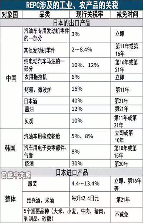 據日本《讀賣新聞》報道,在RCE P框架內,日本將對8 0%以上的進口商品免除關稅。預計日本將對8 6%的中國商品免除進口關稅,對韓國免除 8 1 % , 對 東盟國家免除8 8 %。而日本出口的產品,包括電動汽車發動機、蓄電池零件和鋼鐵制品,將獲得中國8 6 %的進口關稅免除,韓國83%,東盟國家86%至100%。據日本媒體的報道,中韓兩國都將在協定框架下,分階段撤銷對大約九成日本工業制品設定的關稅。